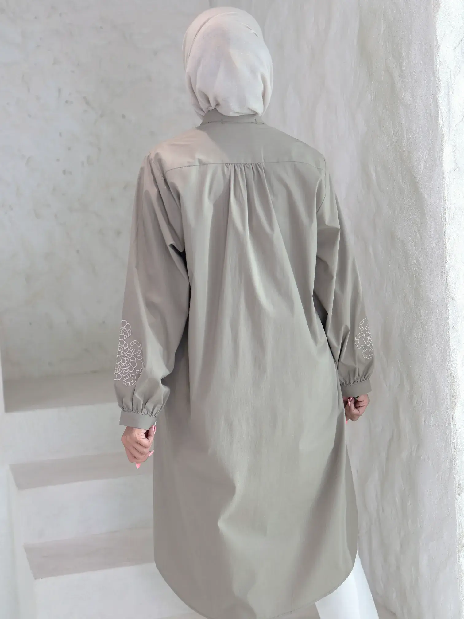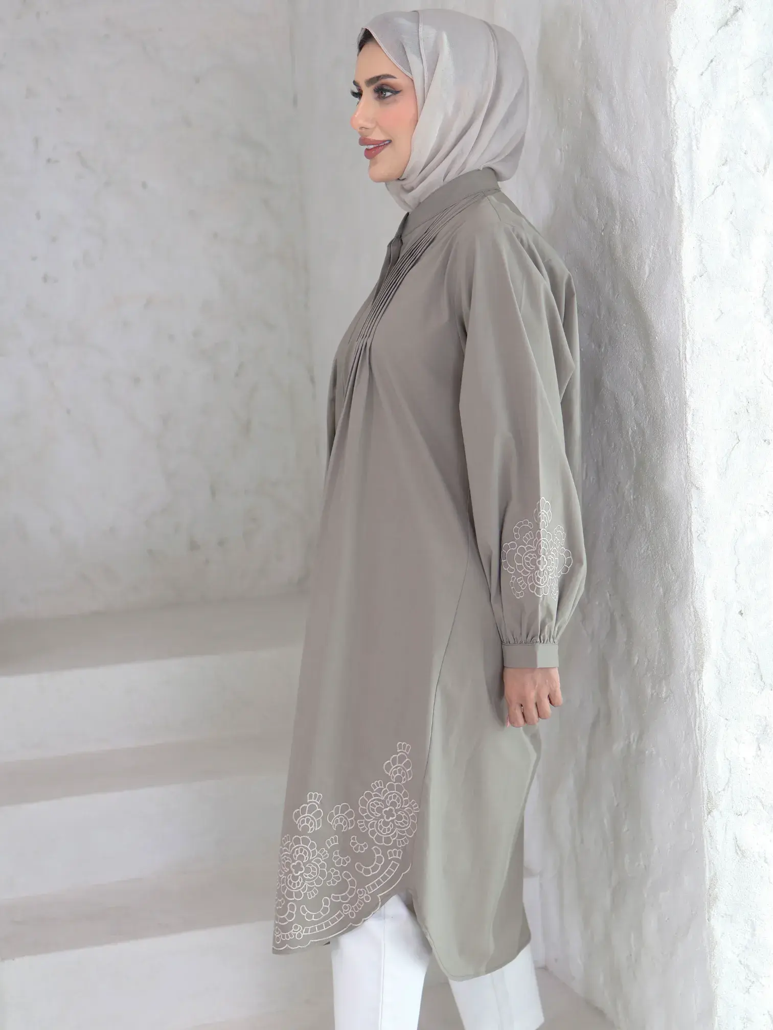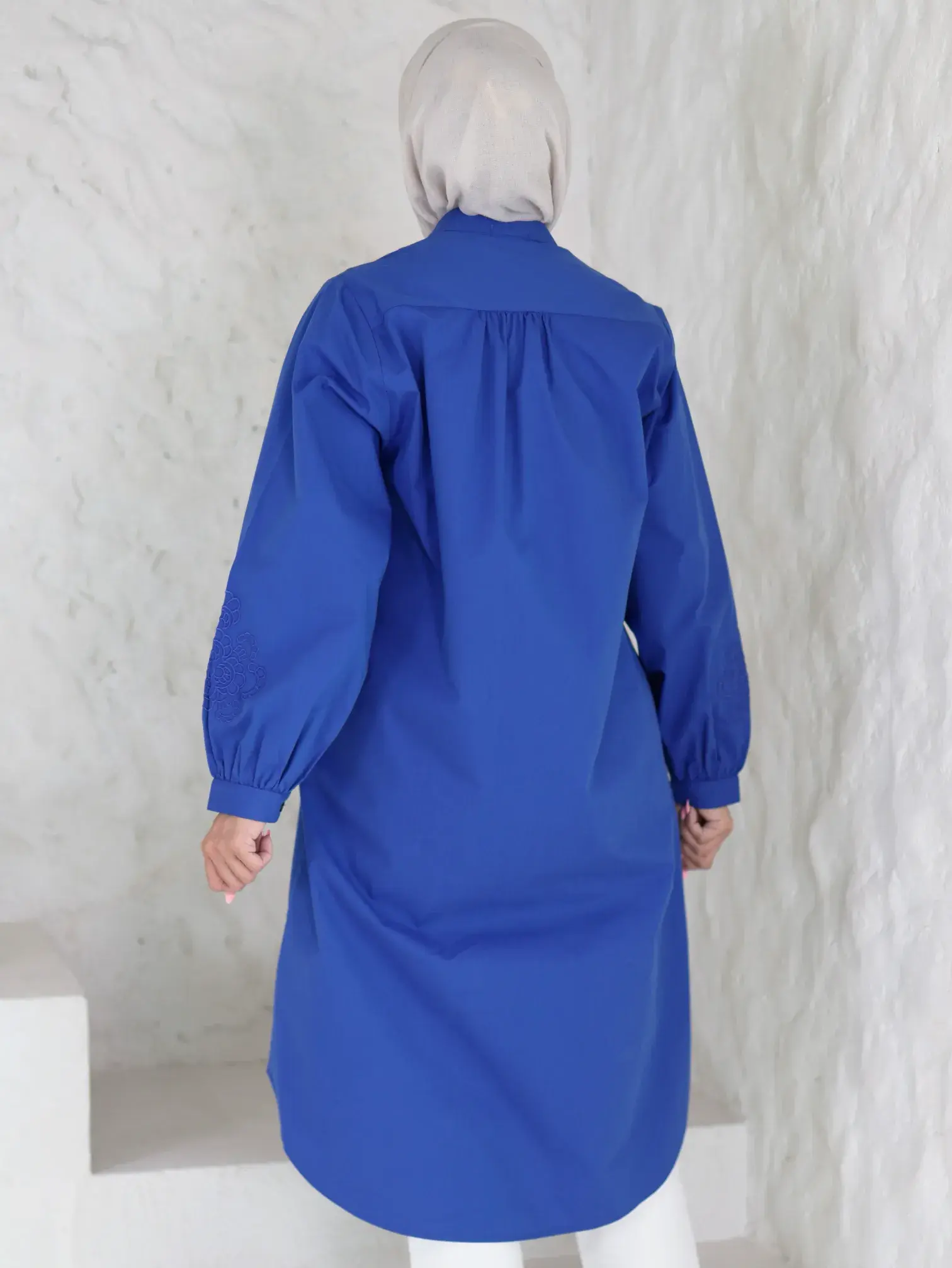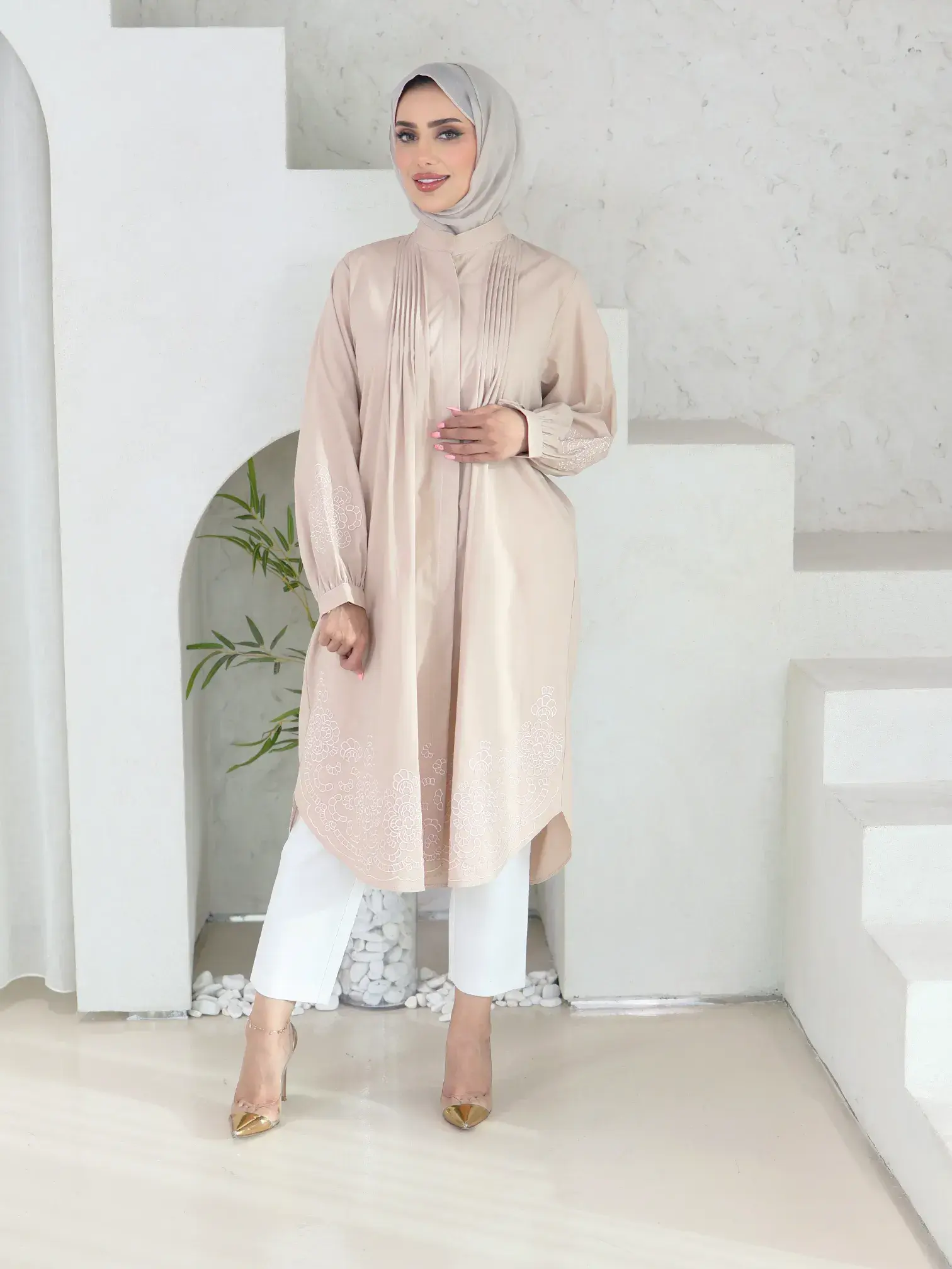 قميص نسائي طويل من قطن بوبلين، يتميز بكسرات أنيقة على الصدر وتطريزات دقيقة على الأكمام وأسفل القميص، مما يضفي لمسة من الأناقة والجمال