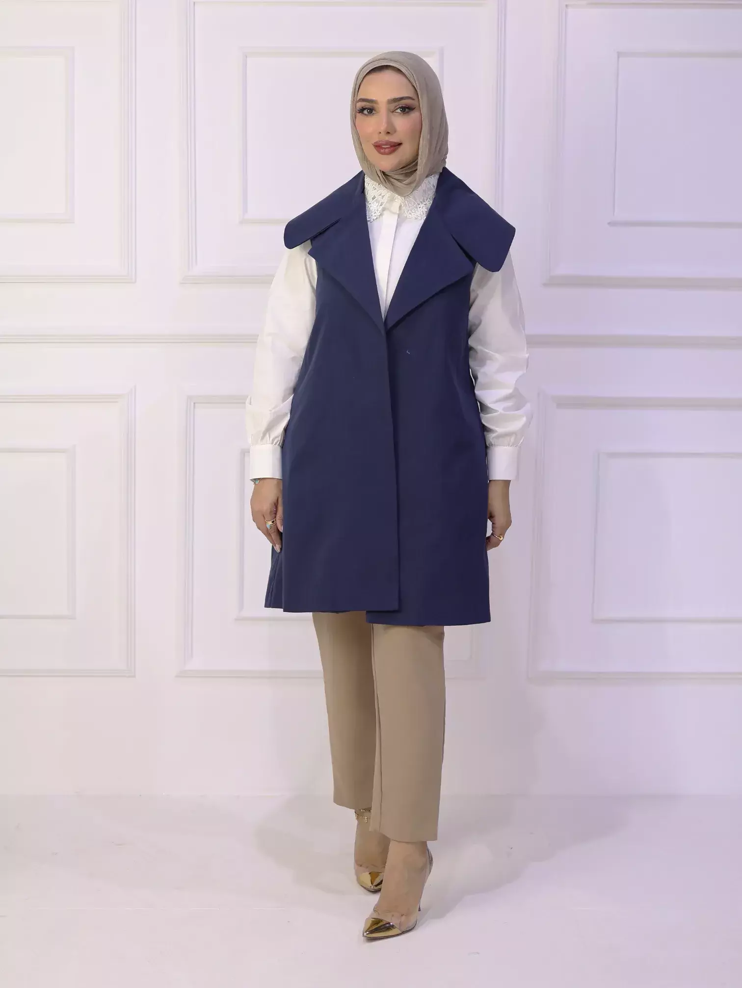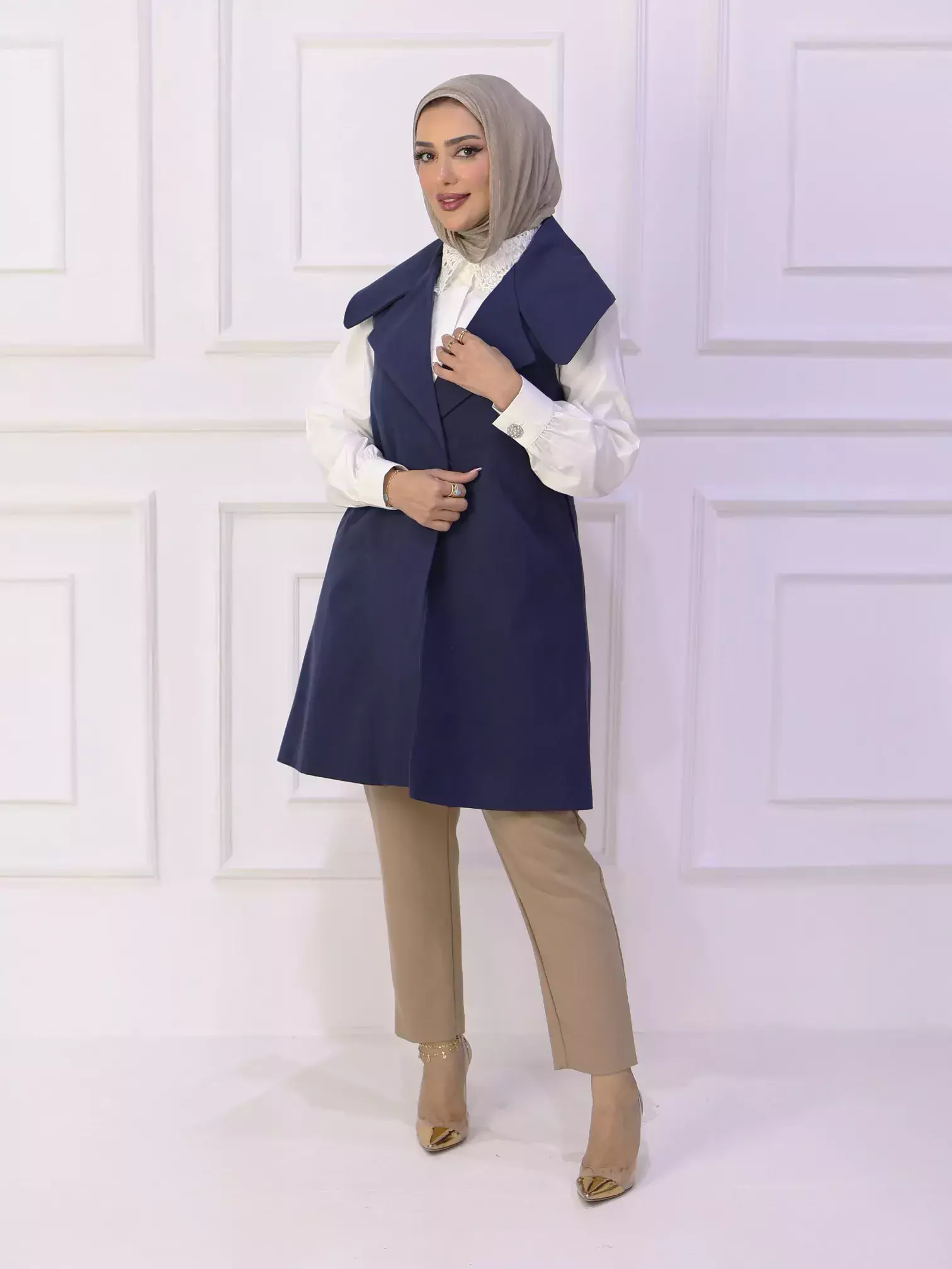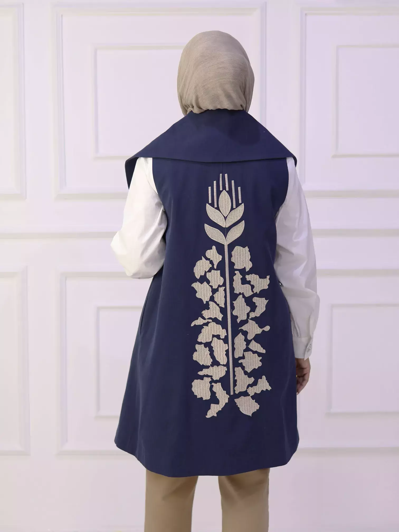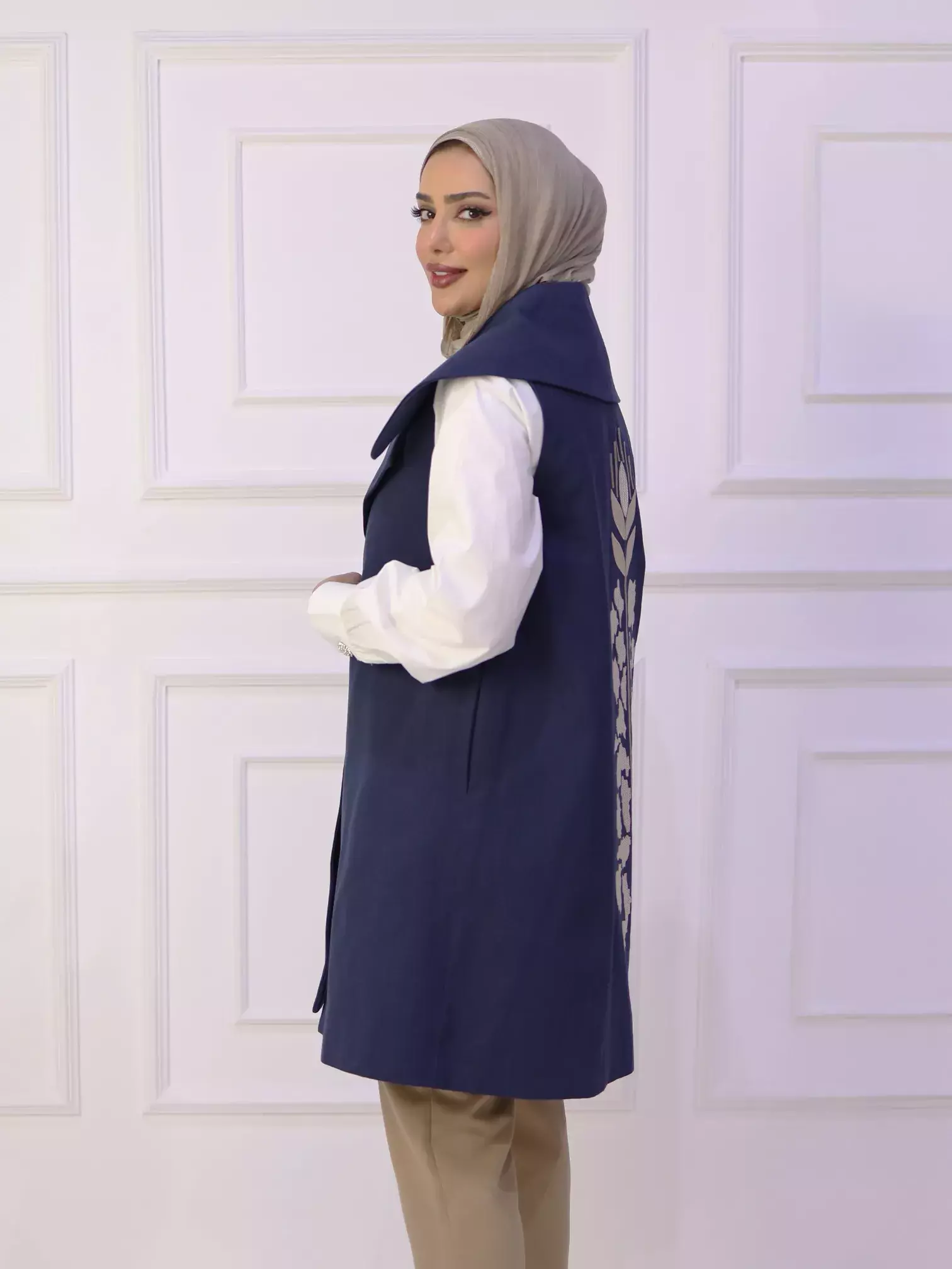 HomeKfardeeni Raw Jelly - Navy - 3Kfardeeni Raw Jelly - Navy - 3BlackWhite0DescriptionA stylish women's gilet crafted from gabardine fabric, featuring a modern design with a large collar and artistic embroidery adorning the back, offering a unique and distinctive look
