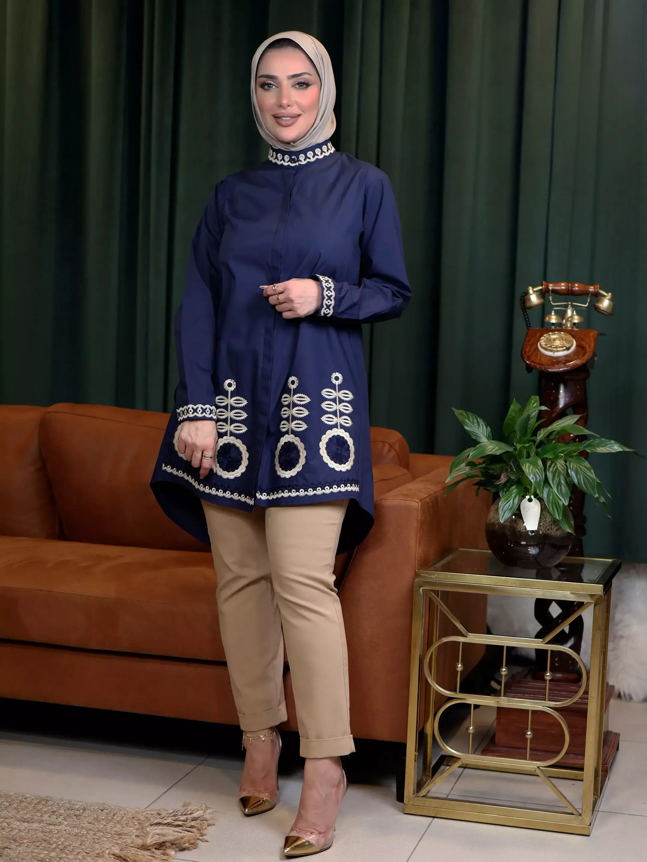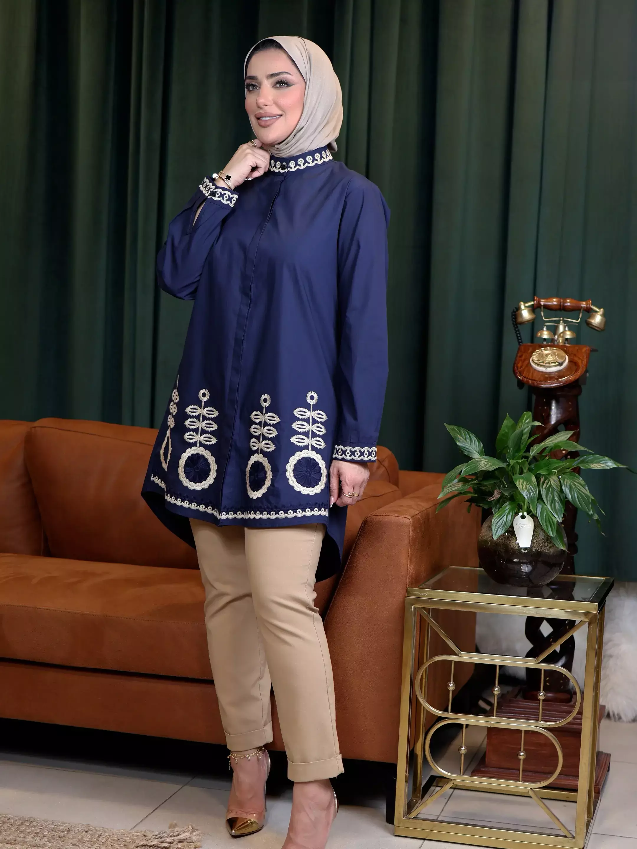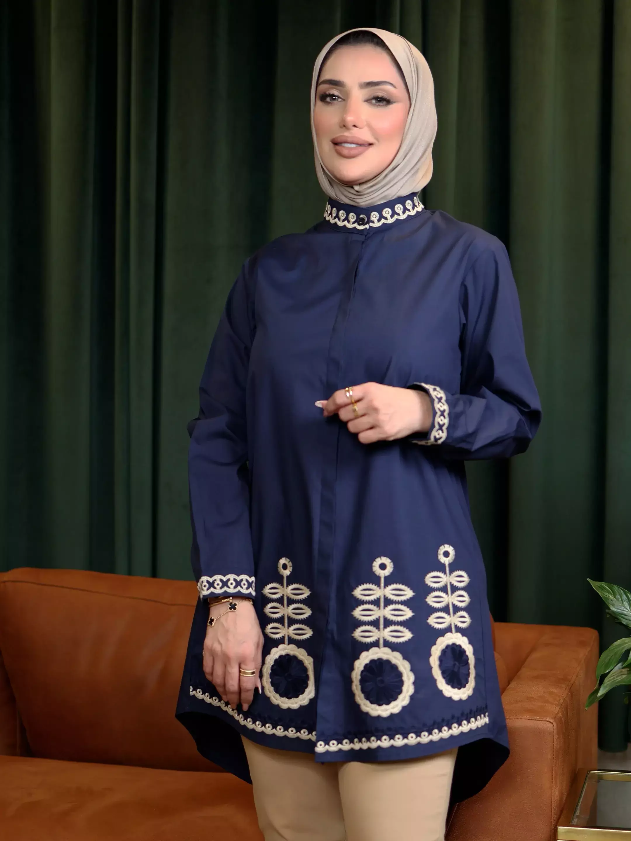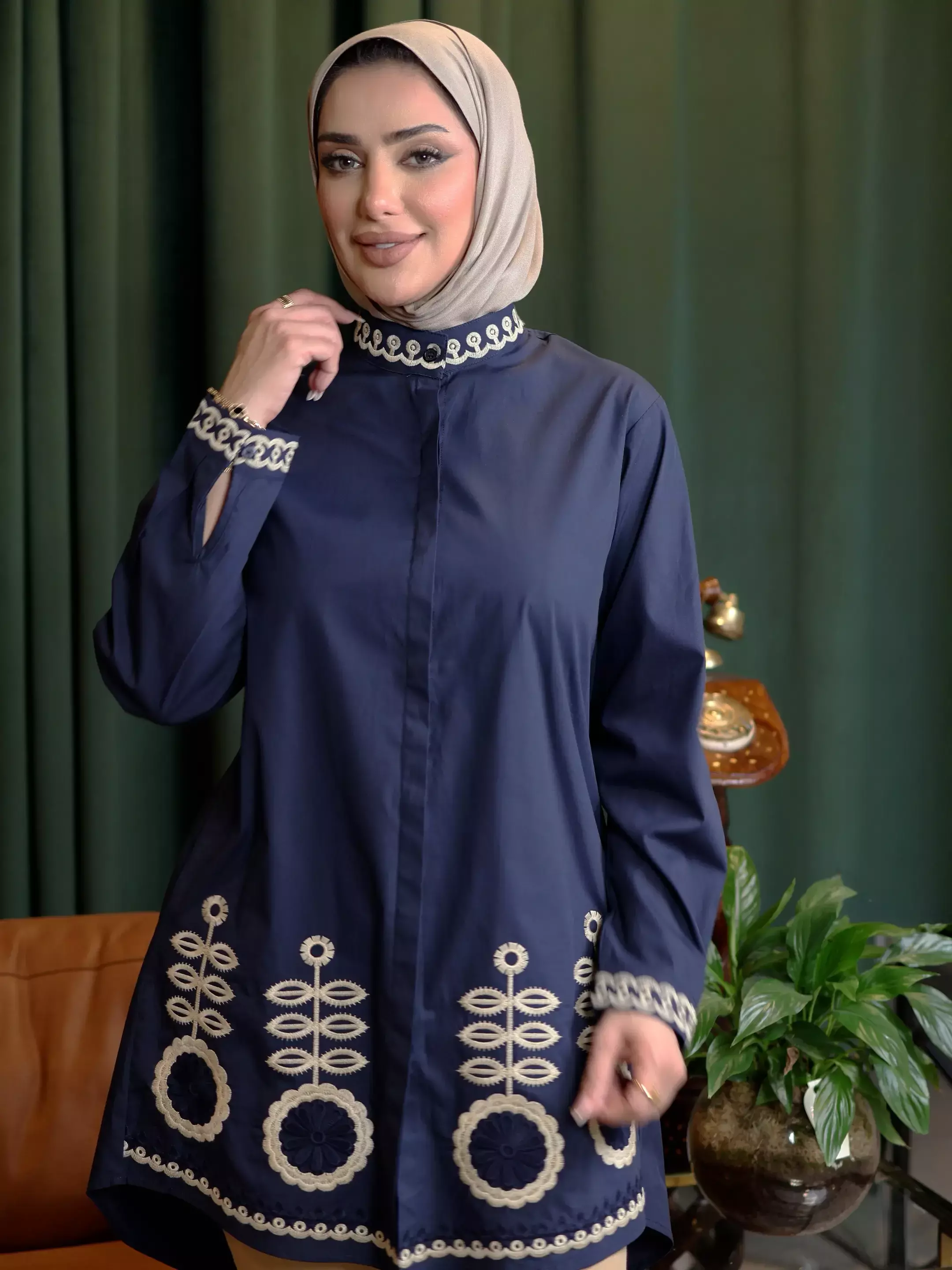 HomeModern Cotton Shirt - Navy - 5Modern Cotton Shirt - Navy - 5BlackWhite0DescriptionAn elegant women's cotton shirt, where sophisticated artistic embroidery harmoniously adorns its upper and lower edges, bestowing upon your look a unique and captivating aesthetic touch