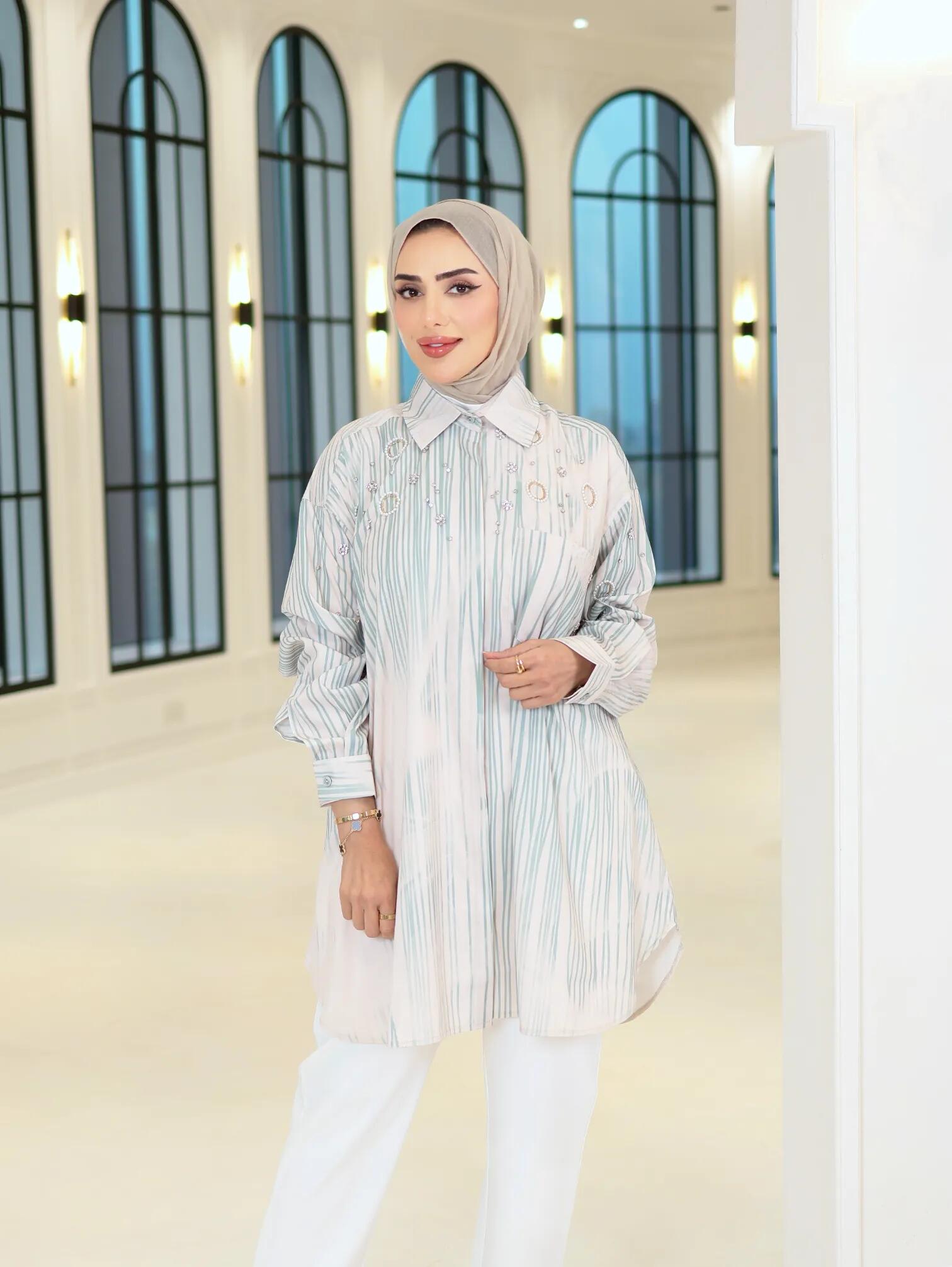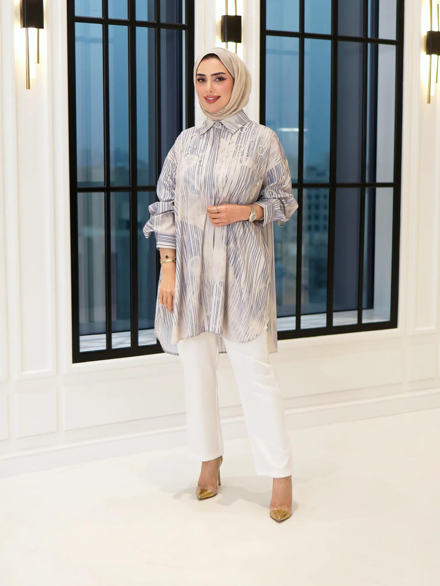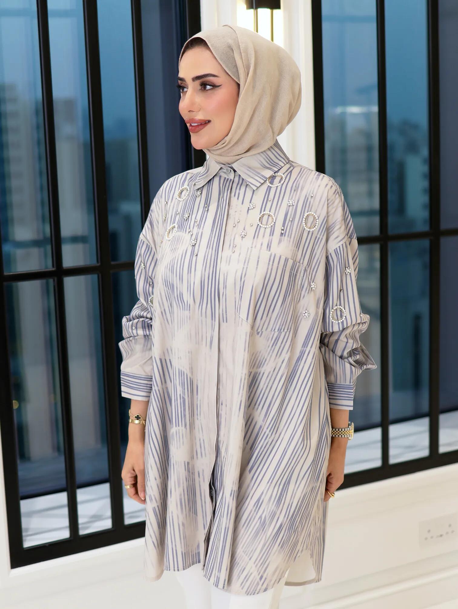 الرئيسيةقميص من القطن الباردقميص من القطن الباردبلاك وايت0الوصفقميص نسائي بتصميم "فضفاض" من القطن البارد المريح، يأتي بنقش خطوط متداخلة ومزين بورود ودوائر من الكريستال تضفي عليه طابعاً مميزاًاللونازرق مقلمتيفاني مقلمالقياس12345