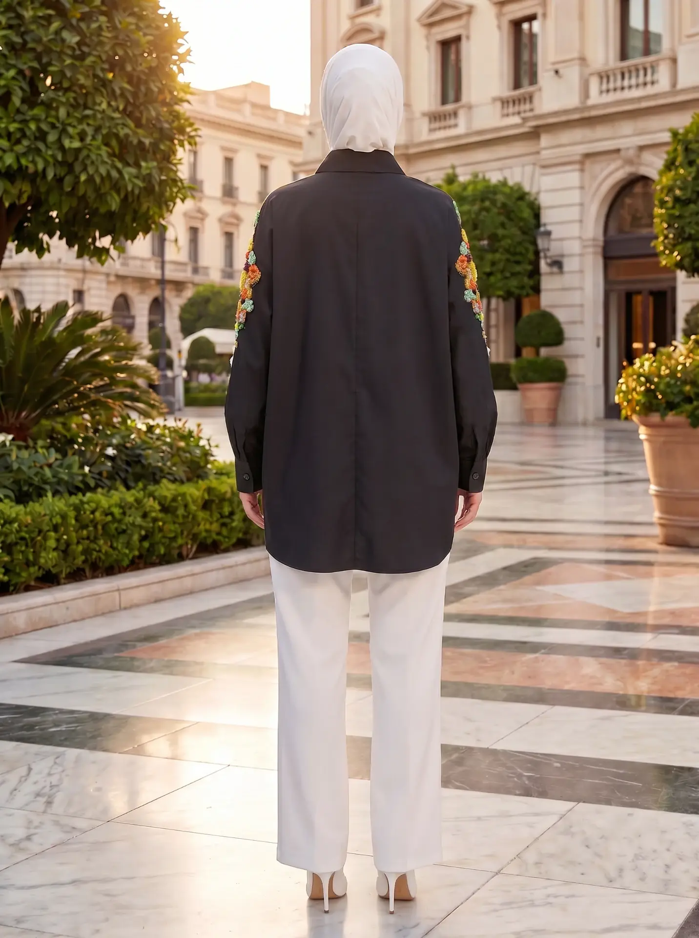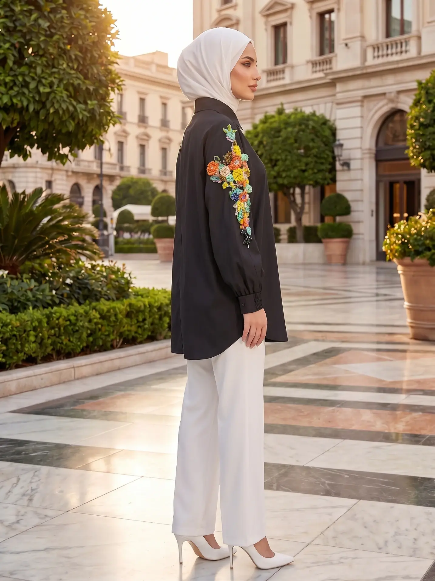 الرئيسيةقميص من البوبلين المزين-اسود-FSقميص من البوبلين المزين-اسود-FSبلاك وايت0الوصفقميص نسائي من قطن البوبلين الناعم يتميز بأكمام مرنة تنتهي بزمات "سير"، مزينة بتطريزات يدوية ملونة من الشك والخرز تمنحه لمسة فنية جذابة
