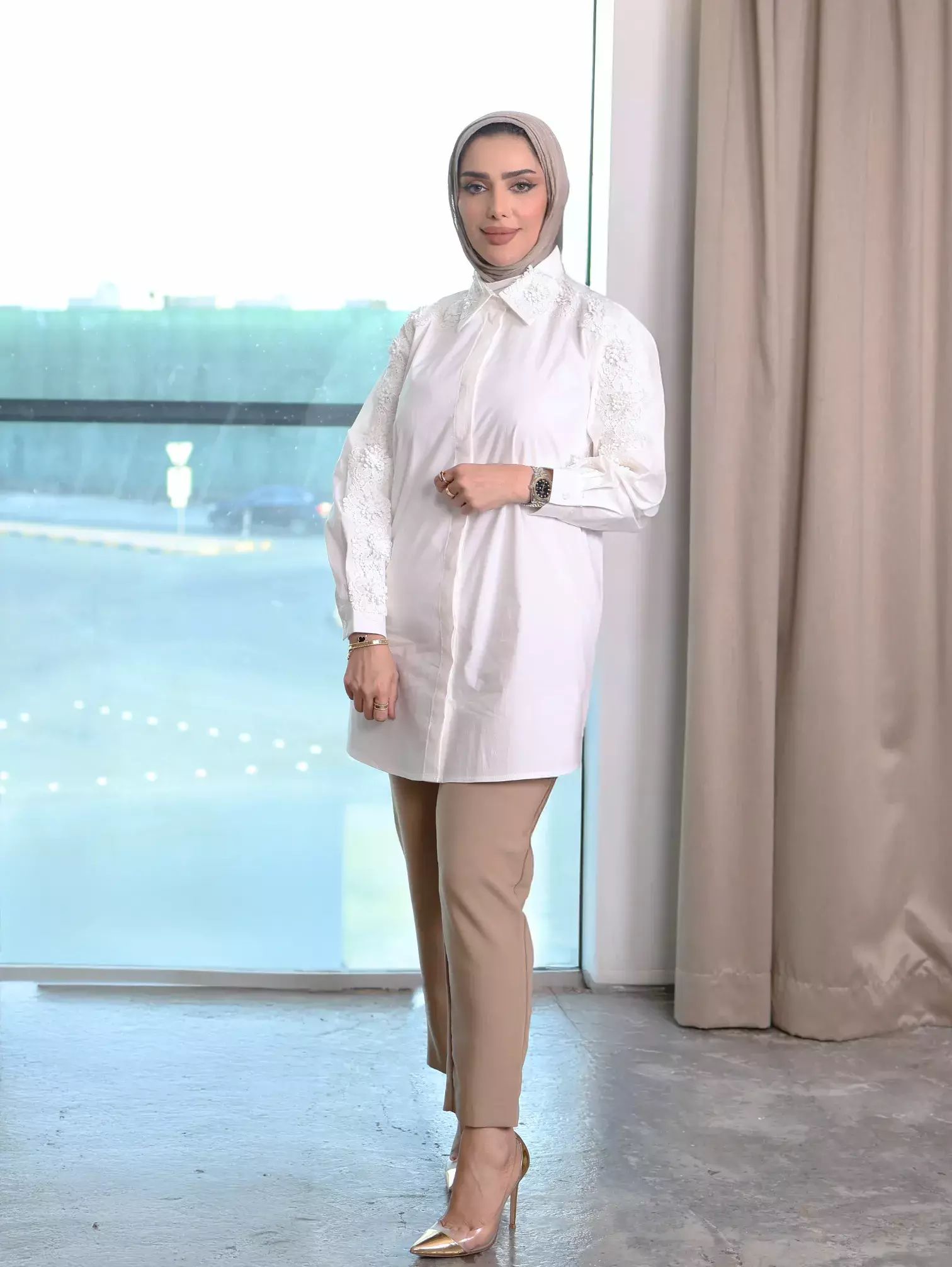 الرئيسيةقميص مطرز بدانتيل - اوف وايت - 4قميص مطرز بدانتيل - اوف وايت - 4بلاك وايت0الوصفقميص نسائي أنيق ومريح من خامة القطن، يتميز بتطريز دانتيل فاخر يزين الكتفين والأكمام بنفس لون الخام، ليمنحك إطلالة راقية ومميزة⚡ بادر الآن! فقط 4 القطع المتاحة