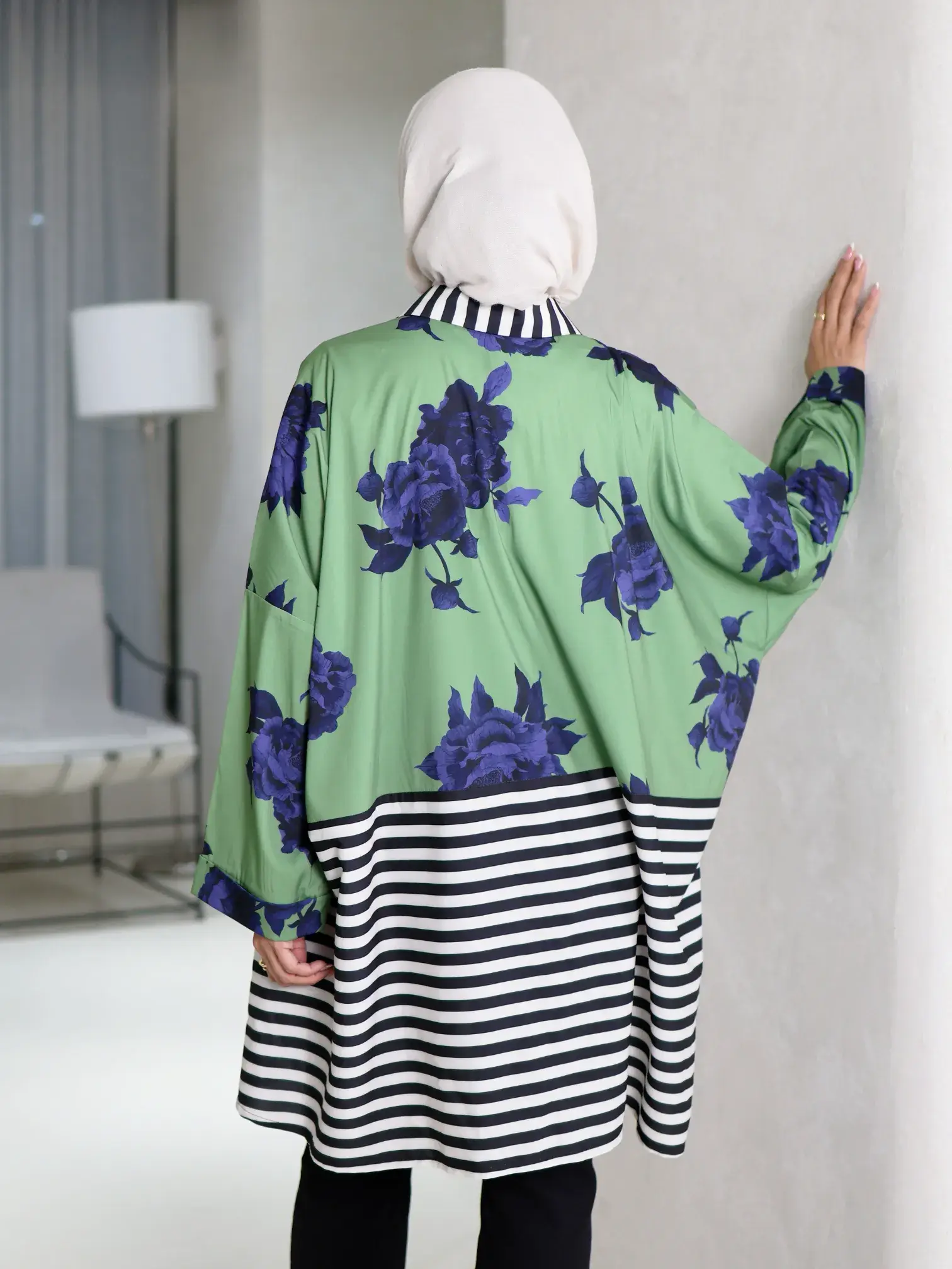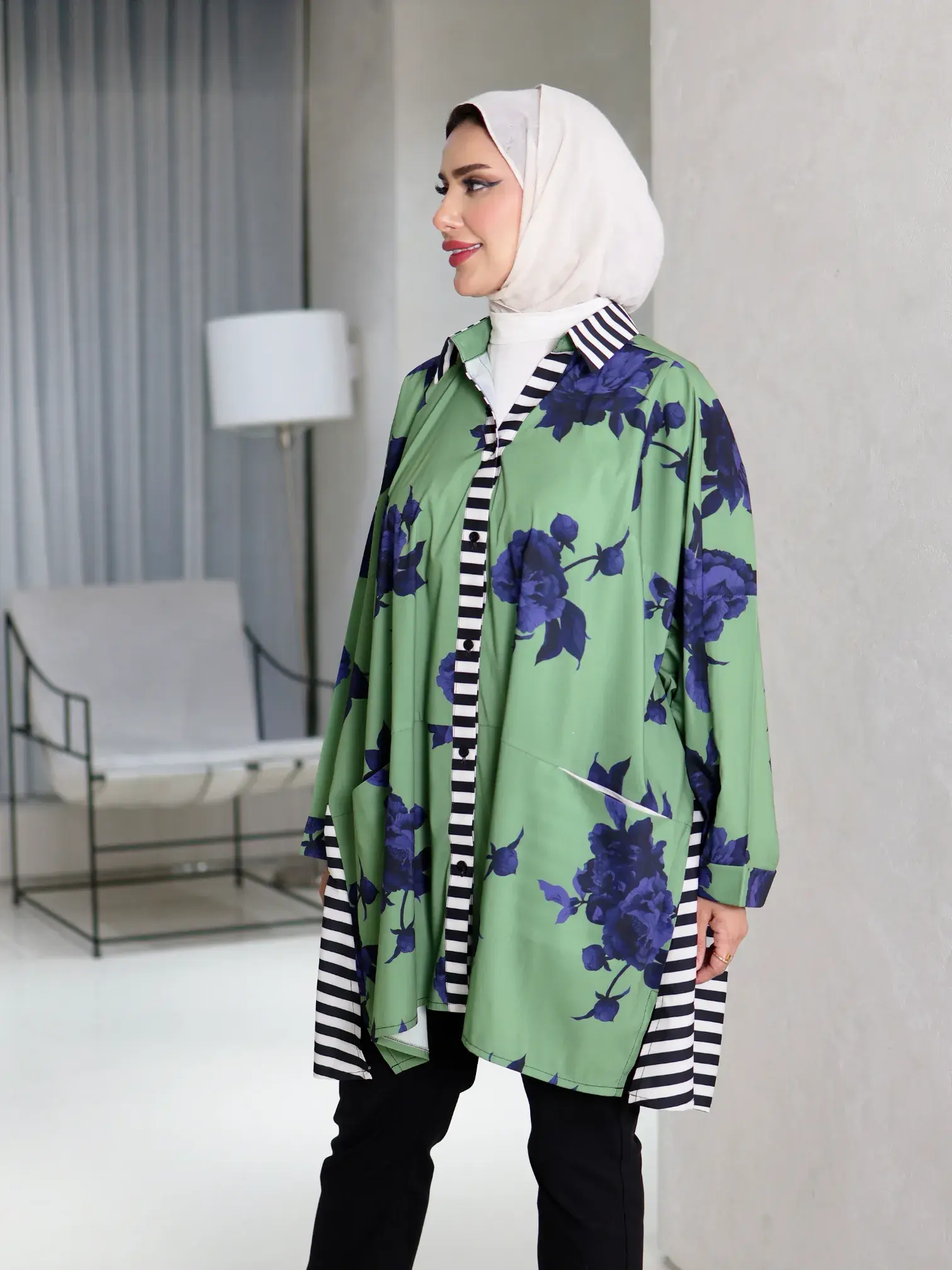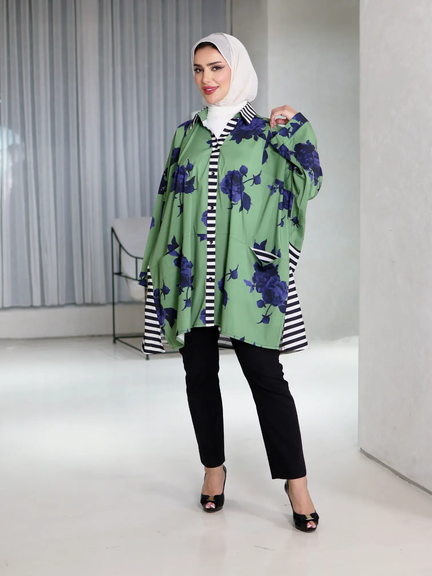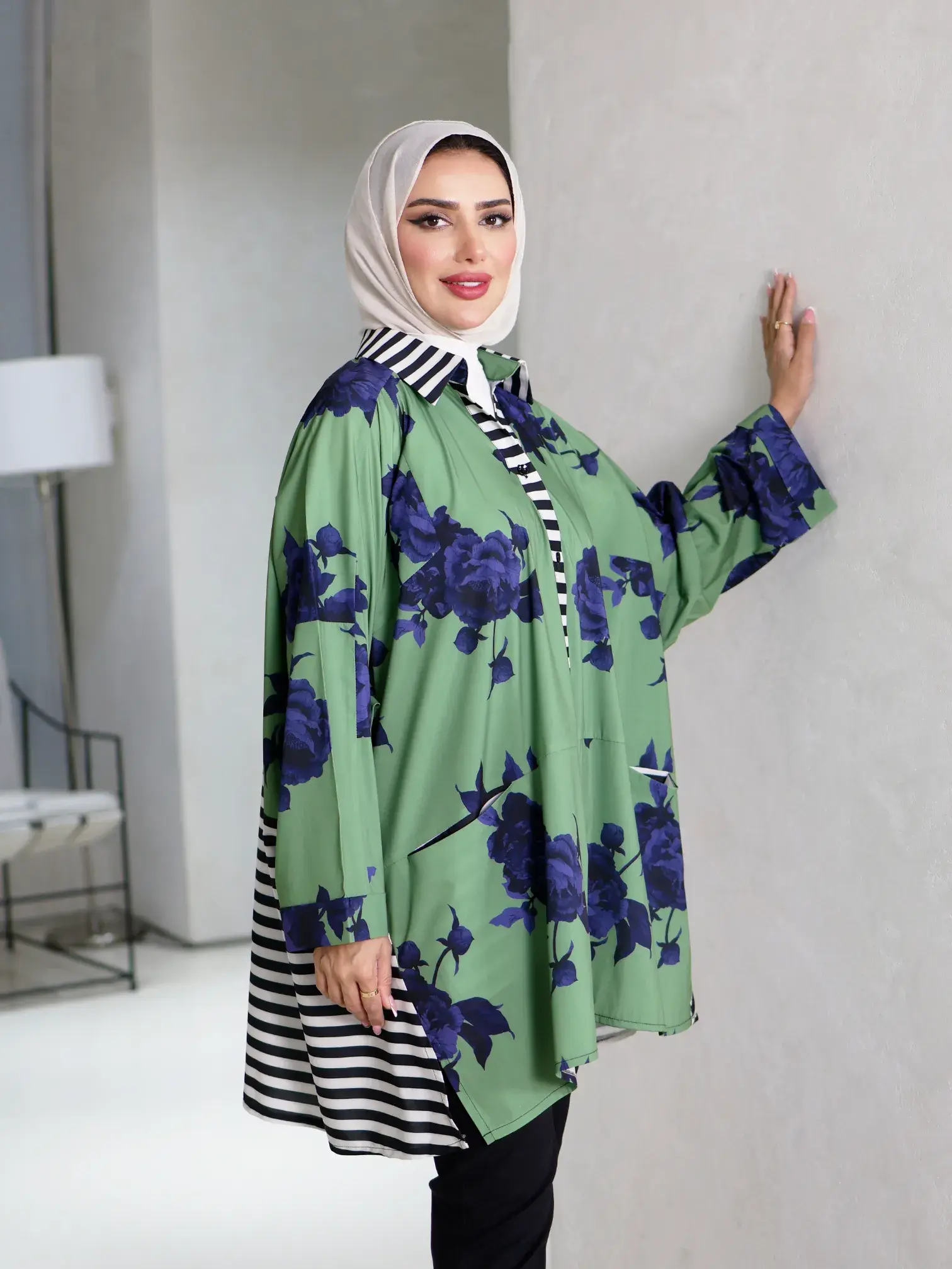 قميص نسائي بقصة واسعة، يتميز بنقشة ورد وخام مقلم متداخل بشكل متناسق. خيار فريد يضمن لك إطلالة جذابة وعصرية تخطف الأنظار