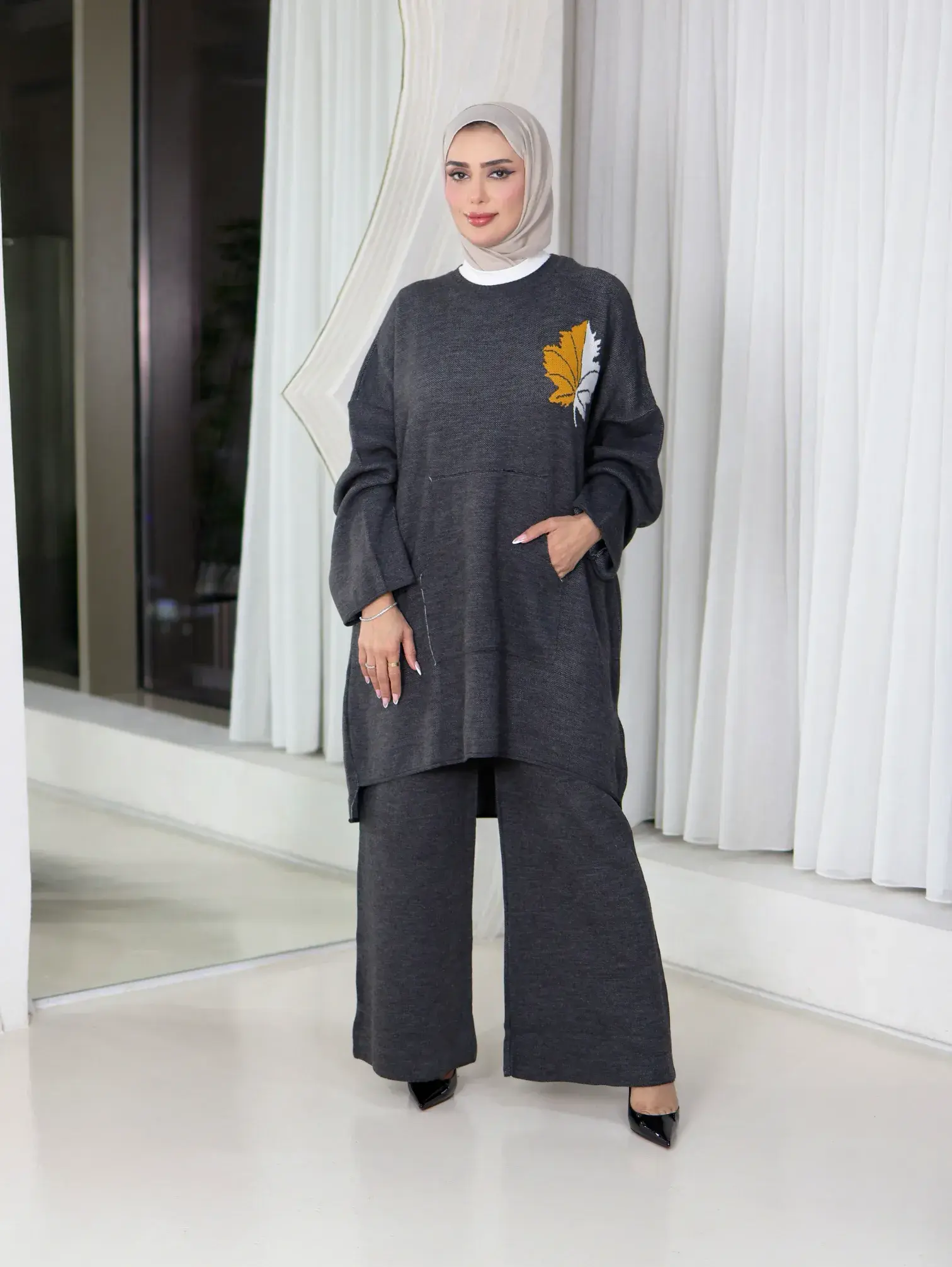 الرئيسيةترينغ من التريكو الفاخرترينغ من التريكو الفاخربلاك وايت0الوصفترينغ نسائي خام تريكو مزين بورقة الخريف من الصدر والخلف. طقم شتوي عملي ودافئ بتفصيل فني مميز، يضمن لك الراحة والأناقة معًااللونكحليرمادي غامق