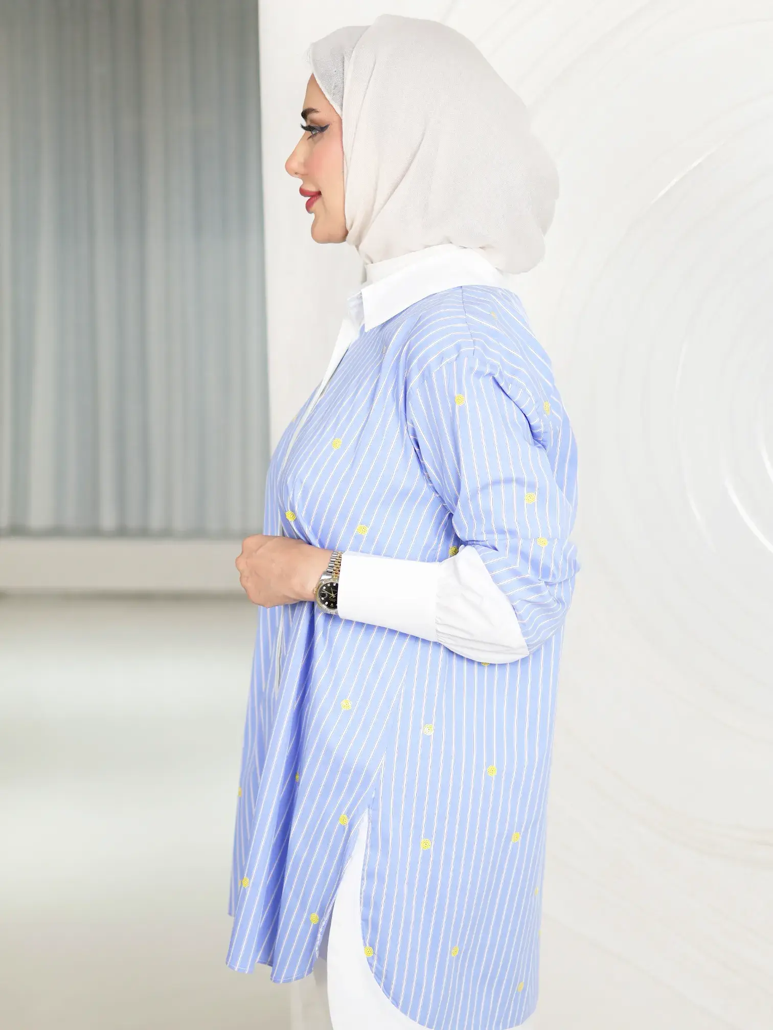 الرئيسيةقميص مزين بالترتر - سماوي مقلم - 1قميص مزين بالترتر - سماوي مقلم - 1بلاك وايت0الوصفقميص نسائي خام قطن مقلم مشكوك بترتر، يتميز بتداخل أقمشة متناسق في الياقة والمنتصف. قطعة عصرية تضيف البريق إلى إطلالاتك اليومية بلمسة جذابة
